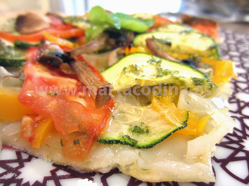 Queda mal decirlo porque la he hecho yo pero está buenísima, de verdad. No echas en falta el queso, es más bien como una coca de verduras. Además, el aceite de ajo y perejil le aporta una textura crujiente y un aroma y sabor inconfundibles. Unas olivitas negras no le hubieran ido nada mal...