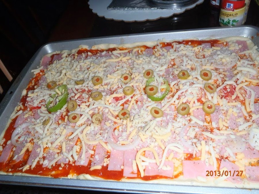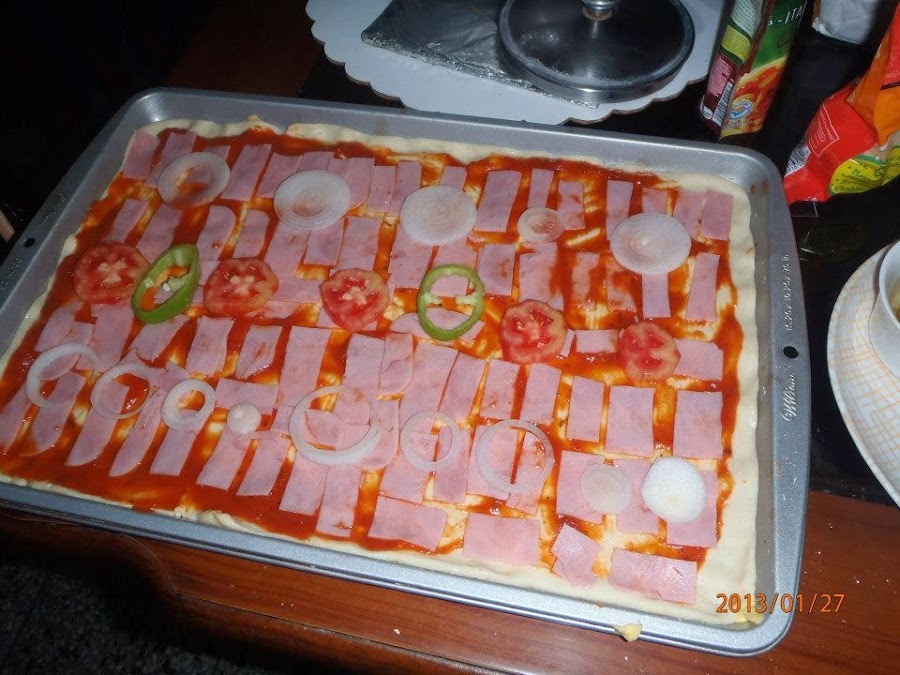 Unte la totalmente la masa con la salsa de tomate, luego haga su capa de jamón o lo que ud. desee, luego coloque la capa de vegetales y luego agregue generosamente el queso, antes de colocarla en el horno deberá agregar el orégano, la albahaca y la pimienta en toda la pizza.
