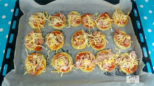 Lo segundo es poner en las rodajas de patata una base de tomate, después un poquito de orégano, el relleno que mas nos guste en mi caso jamón de york y salchichas, la pimienta y por último el queso rayado.