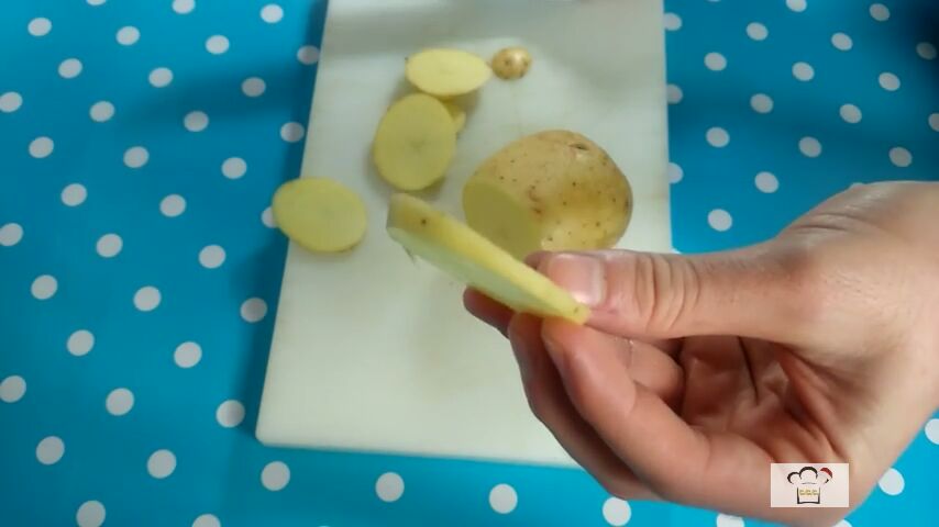 Lo primero que vamos hacer es cortar las patatas en rodajas de 1 cm de grosor. Y las pondremos en una bandeja de horno.