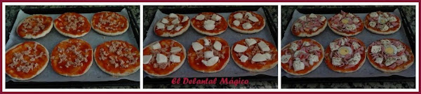 Yo no me compliqué mucho y las hice todas iguales, pero podeis hacerlas variadas, y así las adaptais al gusto de cada uno. Podeis poner bacon, aceitunas, champiñones, rúcula, en fin, cada vez con unos ingredientes diferentes.
