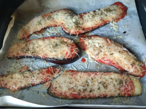 -Sacamos las berenjenas le ponemos tomate frito por encima , el queso rallado y el orégano