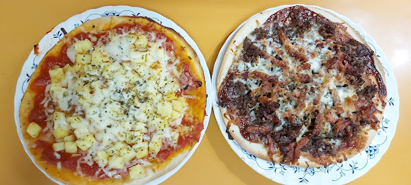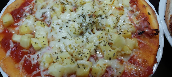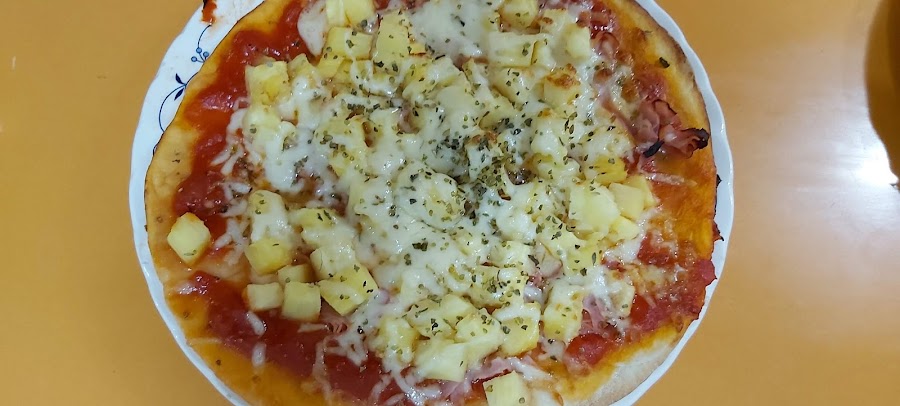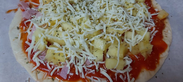 Cortamos la piña en daditos. Cubrimos la base de pizza con el tomate frito y espolvoreamos mozarella. Encima del queso añadimos el jamón a dados y el queso de ensalada a dados. A continuación los trozos de piña. Volvemos a poner mozarella y echamos orégano al gusto.