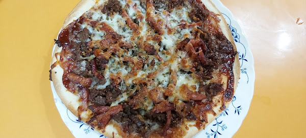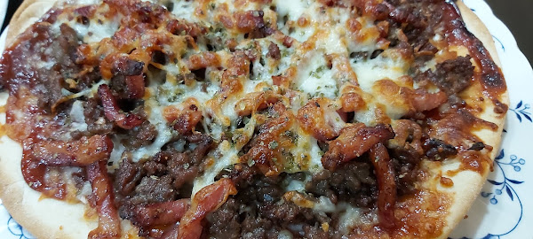 Encima de la salsa pondremos la mozarella bien repartida, la cebolla picada, la carne picada que hemos cocinado, el beicon y cubrimos todo con mozarella.