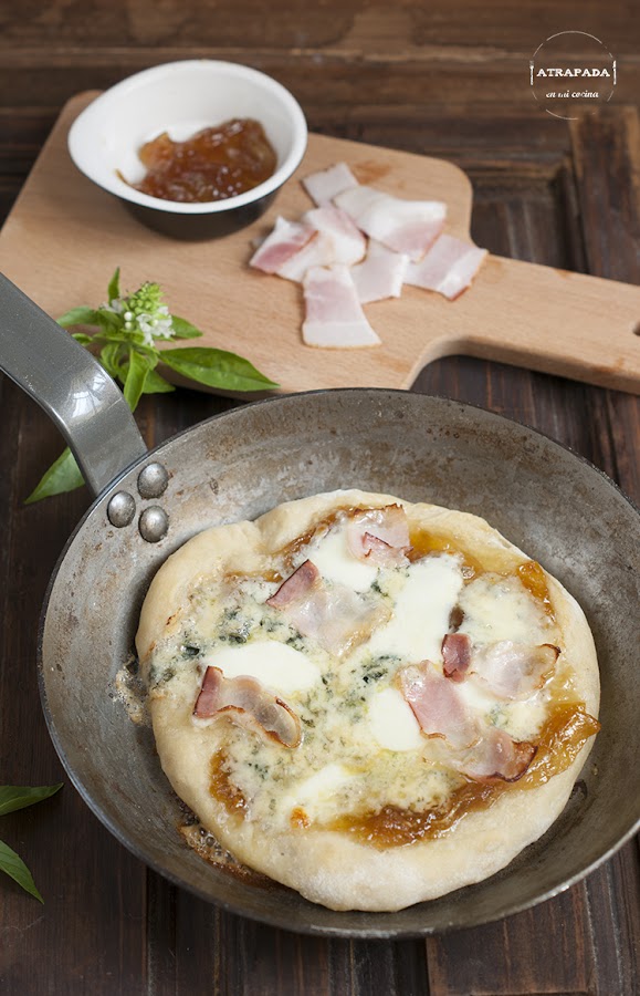 Para la pizza de cebolla caramelizada, bacon y queso azul: