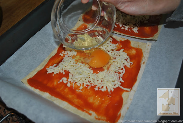 Ponemos un poco de mozarella rallada en el centro de la tortilla y sobre ella el huevo. Podeis usar cualquier queso que tengáis a mano. Incluso utilizar huevos de codorniz.