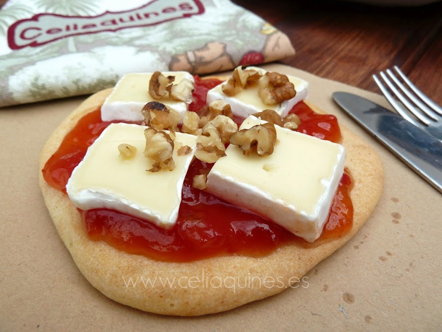 5) Sacar las pizzetas y aún calientes echarles por encima la mermelada de tomate y el queso brie en trocitos.