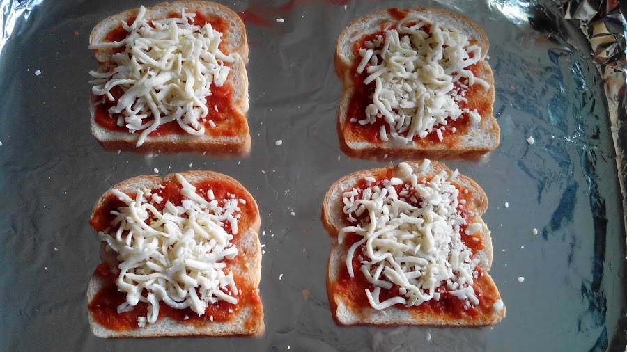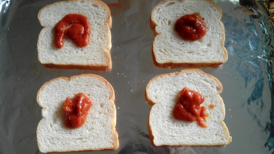 Colocamos las rodajas de pan en una bandeja para hornear y les colocamos dos o tres cucharadas de salsa. Si el pan es muy fresco lo puedes untar con mantequilla antes para que no se absorba mucho la salsa y no se aguade.