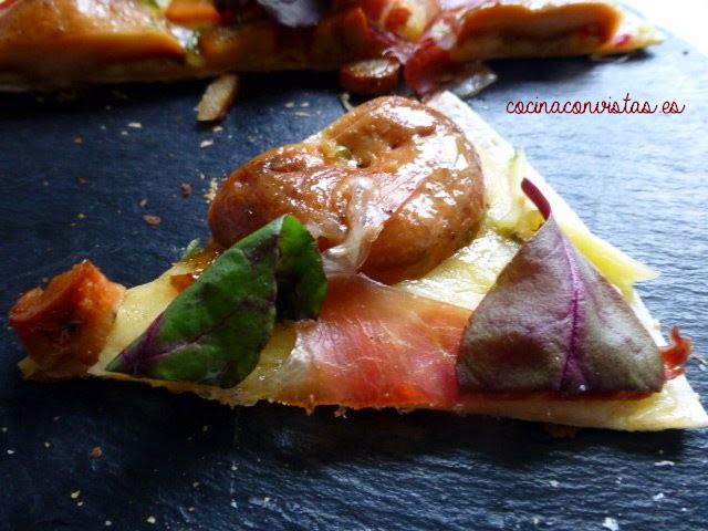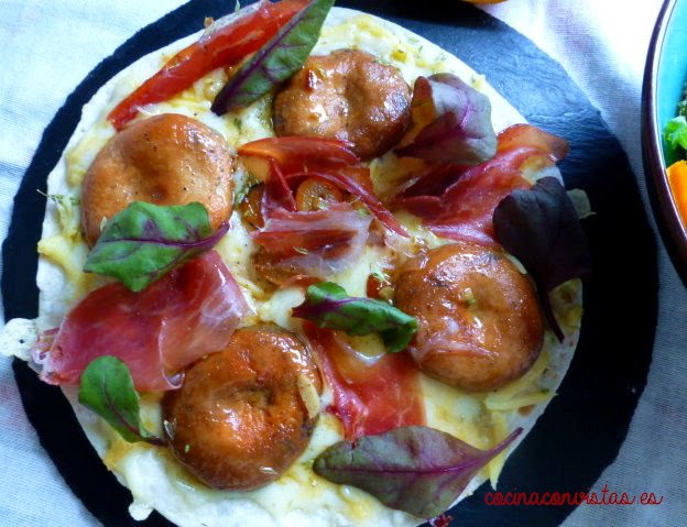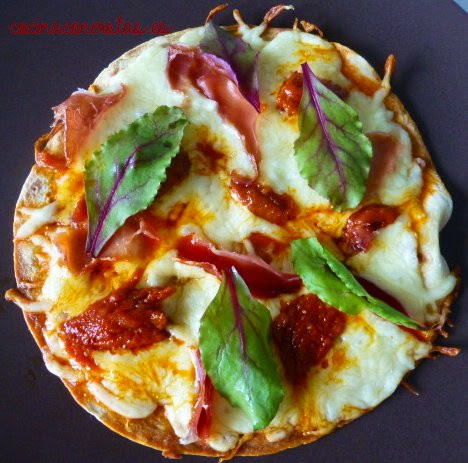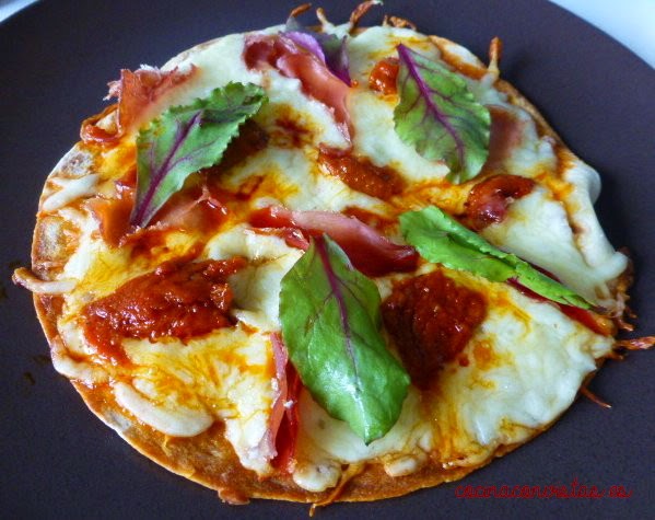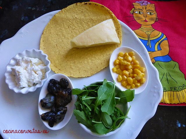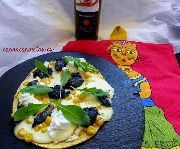 encima colocamos los granos de maíz dulce, el cuitlacoche, el queso crema en pequeños montoncitos y unas hojitas de rúcula para darle el toque verde y fresco. Ponemos la tortilla en una sartén sin gota de aceite o en una plancha a fuego medio/bajo . Cuando el queso esté completamente fundido como el resto de los ingredientes no necesita cocción?Ya está!!!PIZZILLA DE SOBRASADA