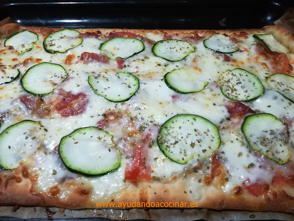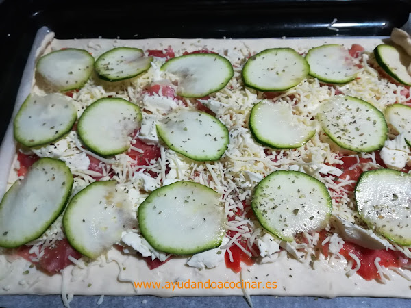 Y por último el calabacín cortado en rodajas muy finas y un poco de orégano que se reparte por encima