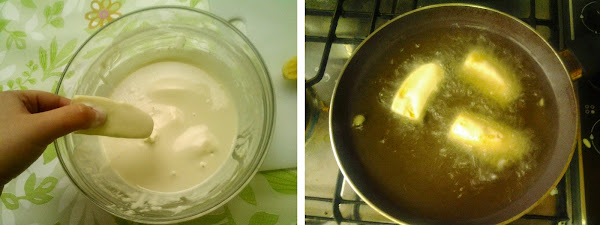 Baña los trozos de plátano en la tempura, cúbrelos bien. Escurre un poco, y fríe en el aceite bien caliente.