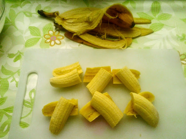 Corta los plátanos en tres trozos, y luego, cada tercio a la mitad.