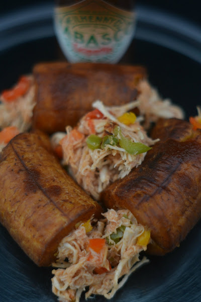 Hola a todos... Aquí os traigo un festín de sabores y colores, se trata de unos plátanos machos verdes fritos a manera de canelón relleno con guiso de pollo a los tres pimientos de colores, con un toque de salsa Tabasco Chipotle, simplemente, extrordinario!!