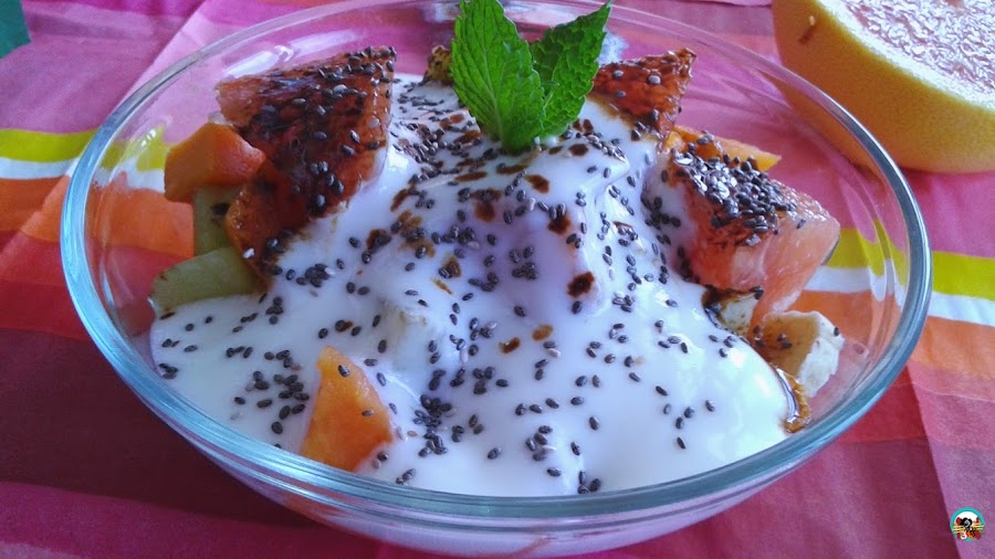 fruta con yogur y café
