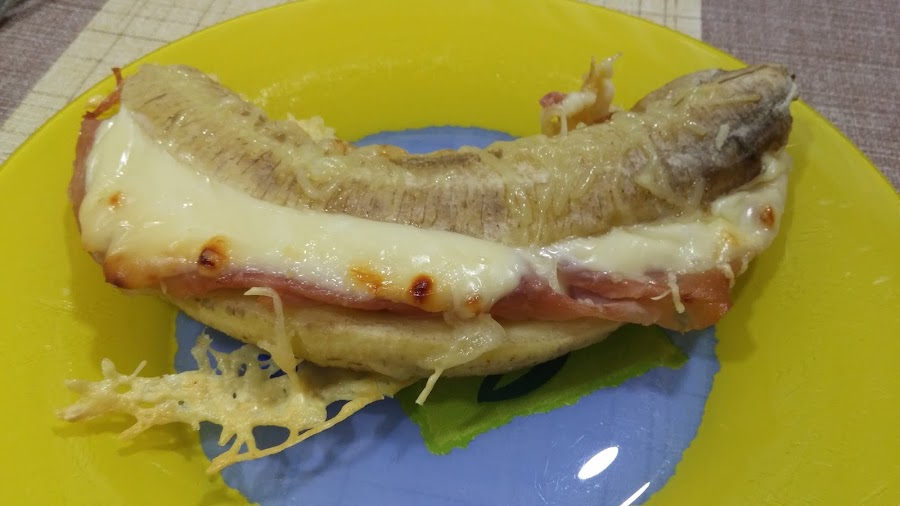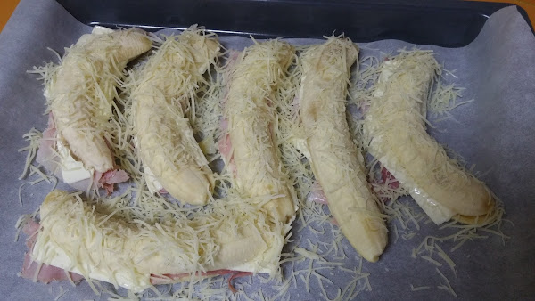Pelamos los plátanos y los cortamos por en medio a lo largo. Los rellenamos con el jamón y el queso para fundir. Podéis poner una o dos lonchas de cada cosa. Los ponemos en la bandeja del horno y les echamos por encima el queso rallado.