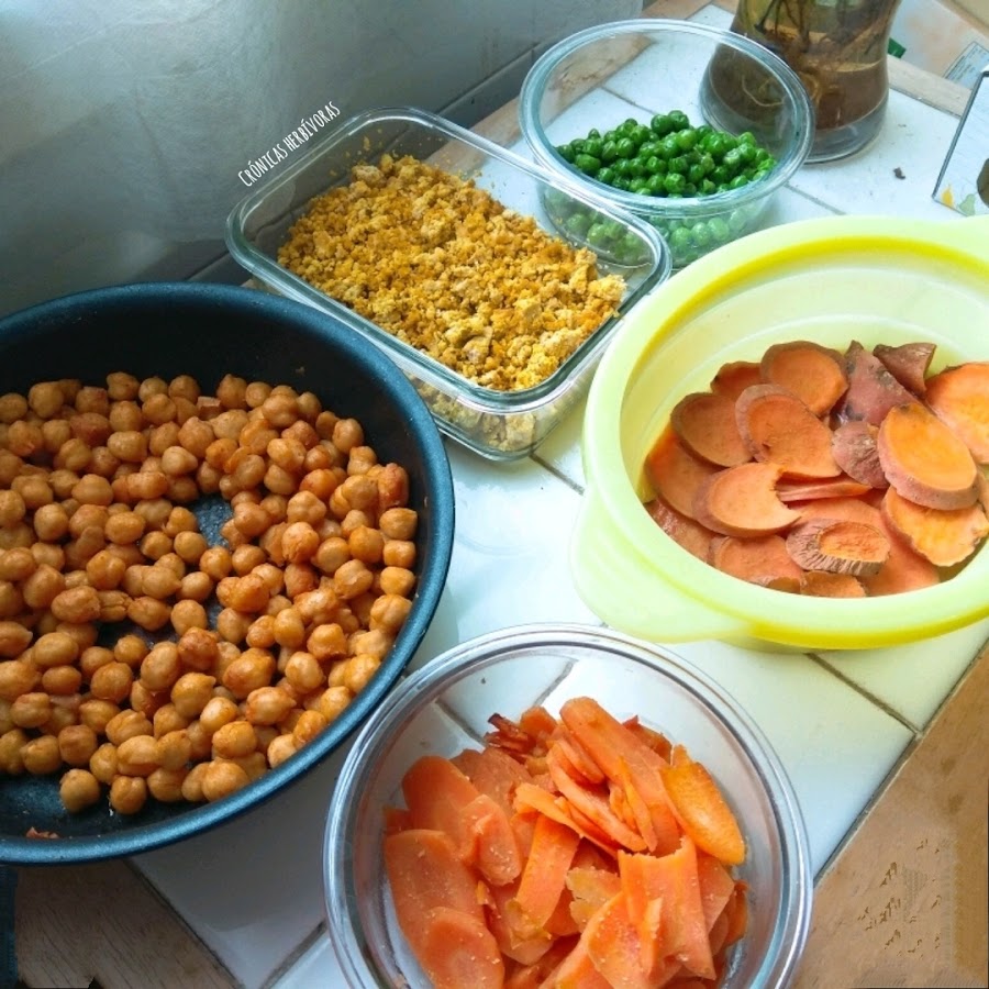 Cuando lo tengáis todo hecho, basta dejar enfriar y guardar en recipientes de cristal por separado en el frigo. Así cada día podéis organizar el plato como os apetezca: agregar algo nuevo, omitir, etc.