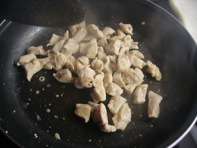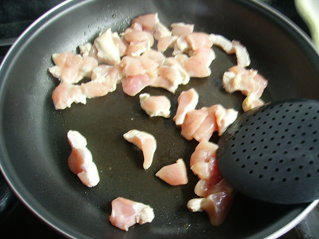 1.- Troceamos la pechuga y la doramos en una sartén con un poco de aceite.