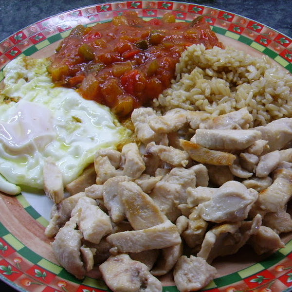 4.- Emplatamos el pollo doradito, junto con el arroz, el huevo frito y un poco de pisto.