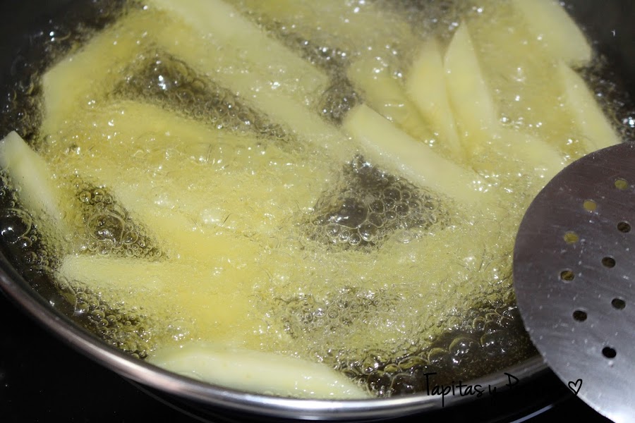 Cortamos la patata a tiras y la lavamos y secamos. La salamos y la freímos en abundante aceite.