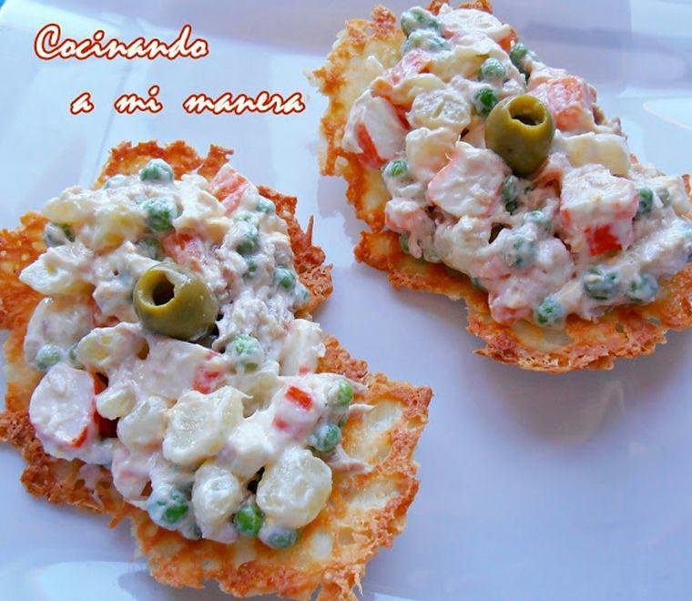 Ponemos a hervir abundante agua con sal y le añadimos patatas y zanahorias cortadas en dados además de huevos enteros y limpios, después de 5 minutos le añadimos los guisantes y cuando la patatas estén en su punto escurrimos todo. Cortamos los palitos de pescado, las aceitunas y desmenuzamos el atún, Juntamos todo cuando este bien frio y le añadimos mahonesa al gusto, reservando en el frigorífico hasta el momento de servir. Además la autora nos sugiere que la acompañemos con unas galletas de queso que tendréis que descubrir pinchando en el enlace.