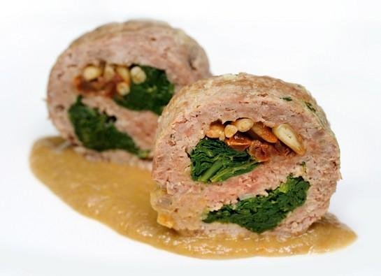 3. Sobre la carne hacemos dos tiras de espinacas, y en el centro ponemos el tomate seco y los piñones. Enrollamos para hacer un rulo. Cerramos los extremos, pinchamos con un tenedor y ponemos en la vaporera.