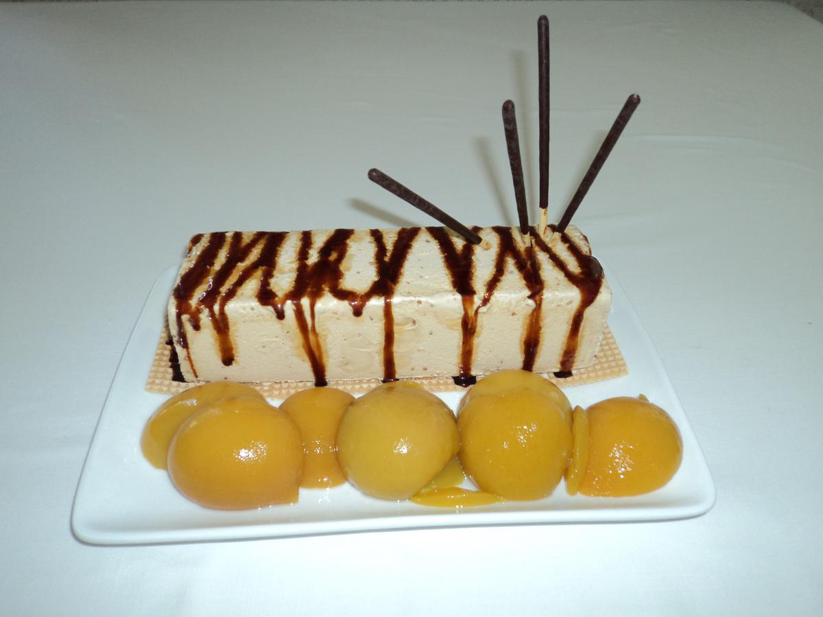 Helado de turrón y melocotones en almíbar. También puede ser helado de otros sabores, pero como estamos en Navidad, toca turrón.