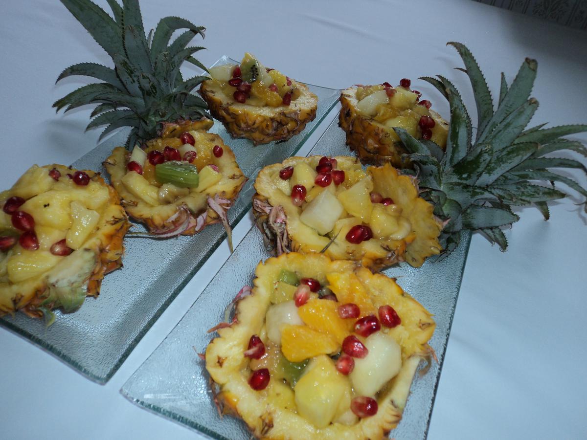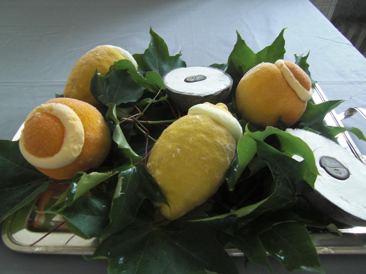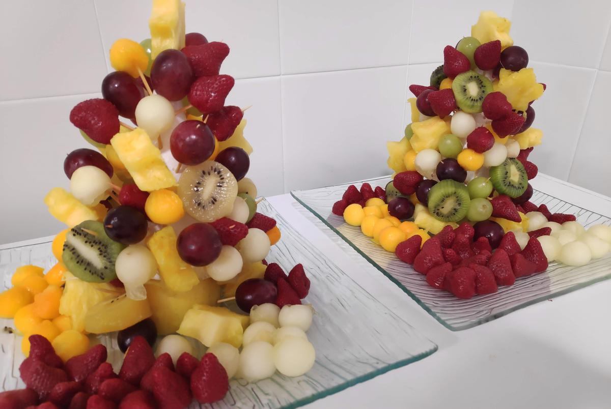 Frutas con helado. Son comprados y están puestos encima de unas hojas verdes.