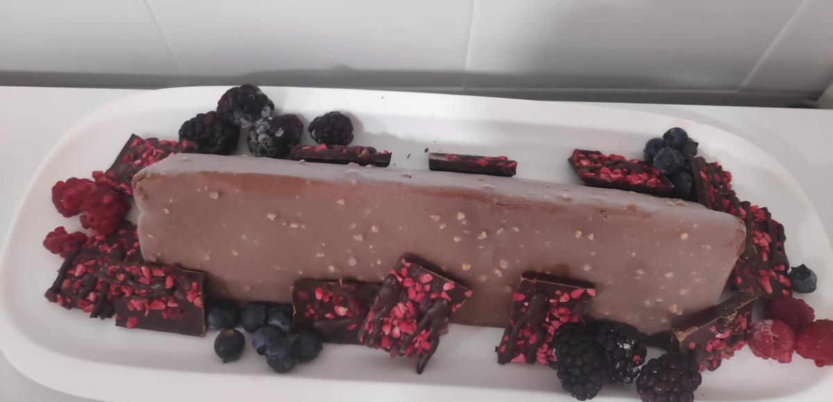Postre de helado de turrón decorado con frambuesas, moras y arándanos y con pastillas de chocolate negro con frambuesa. Todo de Lidl.