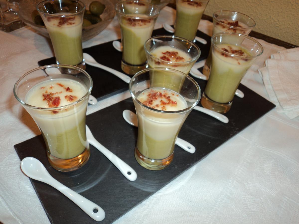 Esto es tan sencillo como comprar unos espárragos verdes y otros blancos. Se trituran por separado con la batidora y se añade un poco de aceite de oliva virgen extra al final. Como tienen distinta densidad, no se mezclan. Y se decora con jamón picado por encima y listo.