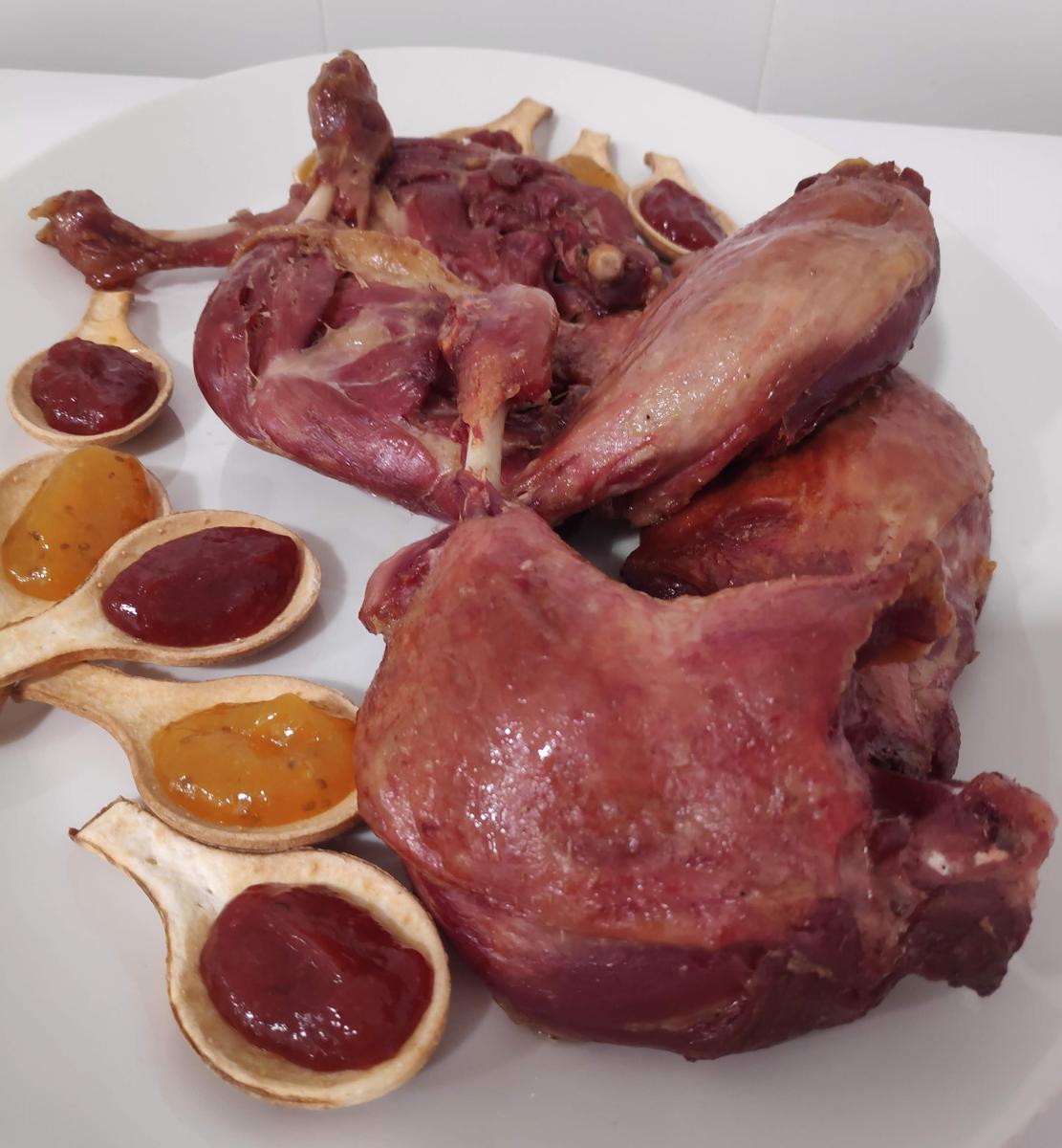 Confit de pato con cucharillas rellenas con confitura de fresa y de naranja. Estos los compré en Carrefour, pero los tienen en muchos sitios.