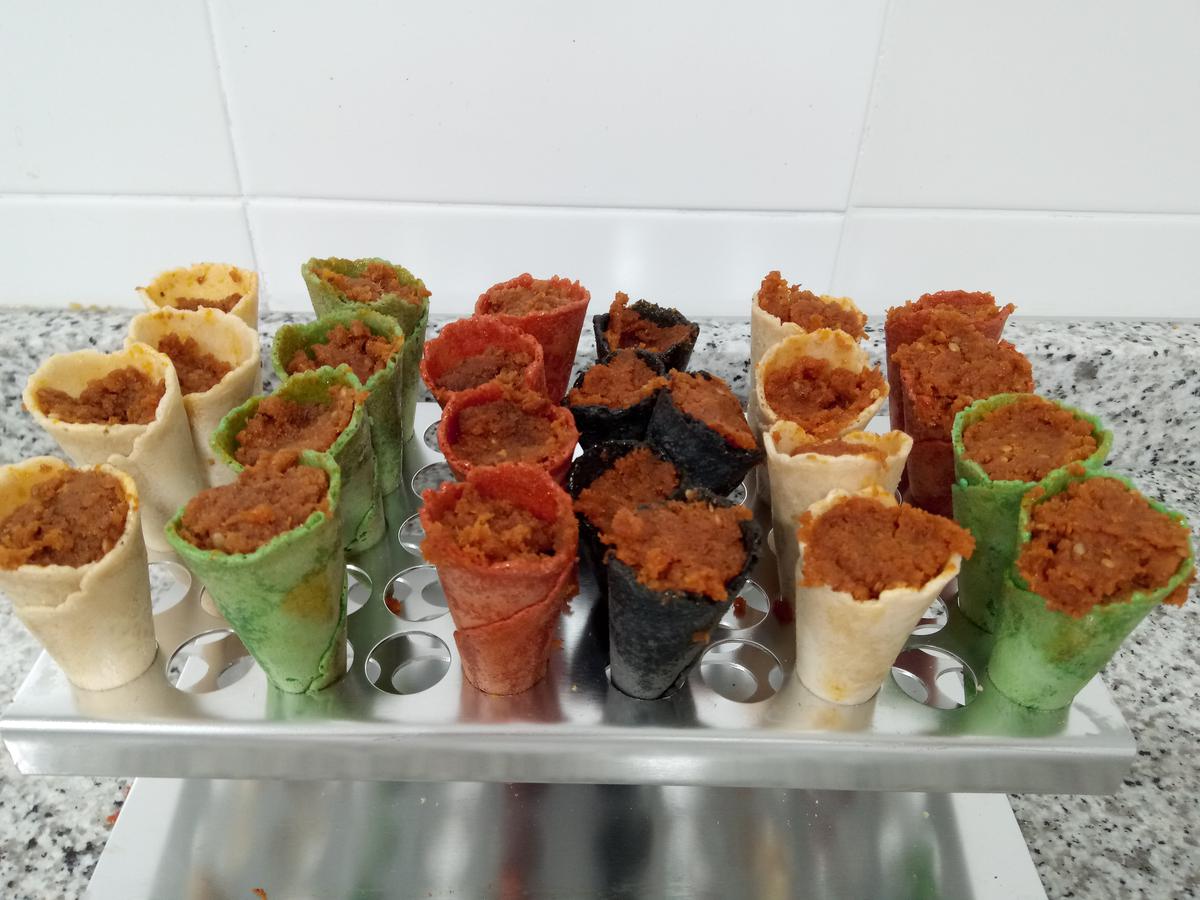 Y los de la derecha son caseros. Están hechos con pasta filo. Otras veces los he hecho con masa de empanadillas comprada. Los rellenos también son caseros.