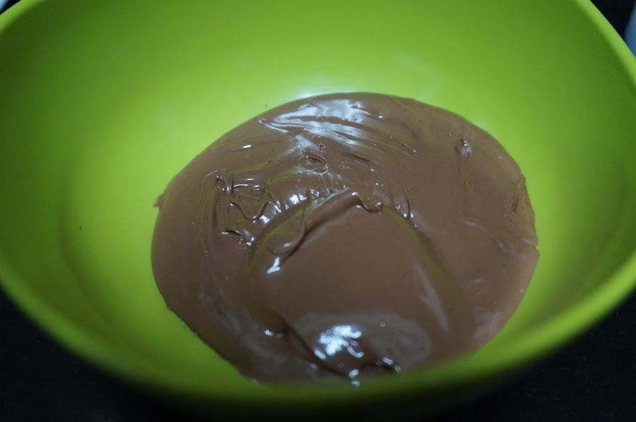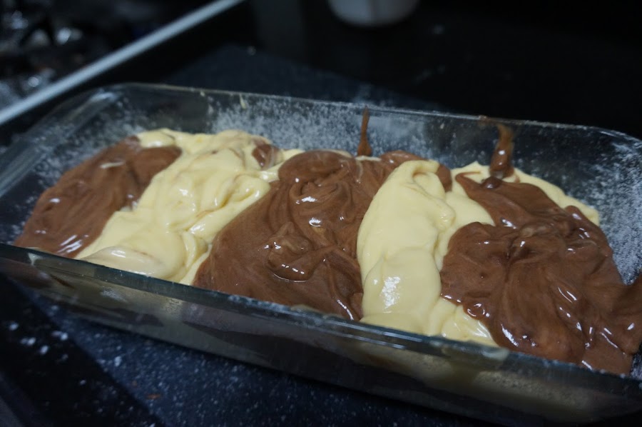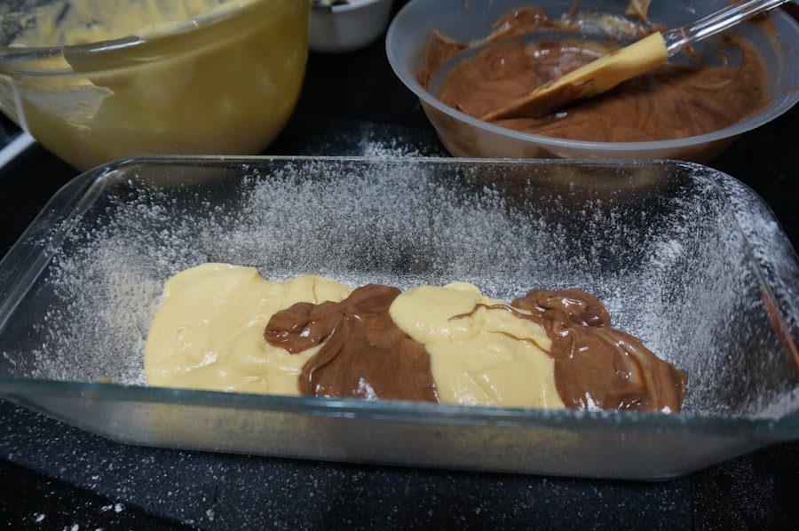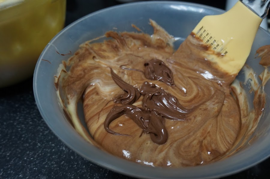 Una vez mezclado, separamos la masa en dos boles y a uno de ellos echaremos la Nutella.