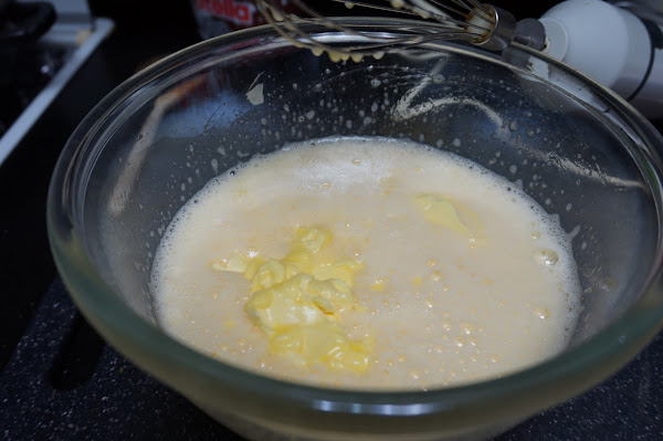 Cuando esté bien mezclado añadiremos la mantequilla que habremos ablandado un poco en el microondas y lo batimos todo junto.