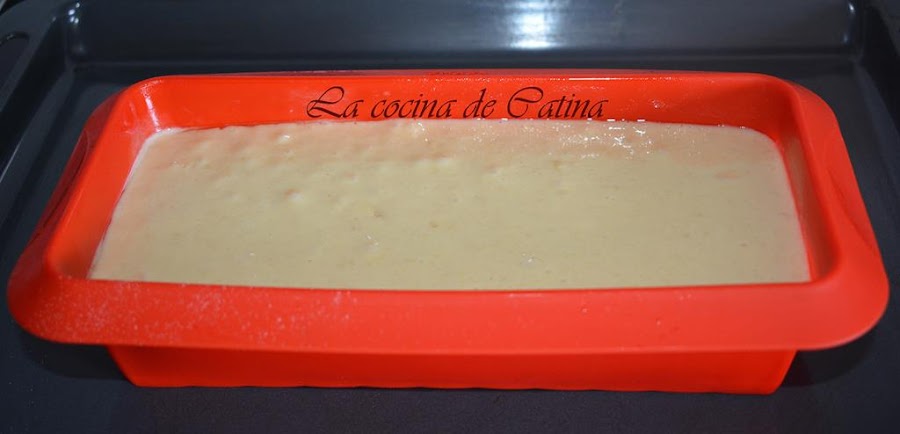 Cubrimos un molde de cake con papel de horno, (yo he utilizado un molde de silicona untado con spray), vertemos en él la mitad de las almendras, la mezcla preparada y completamos con el resto de las almendras.