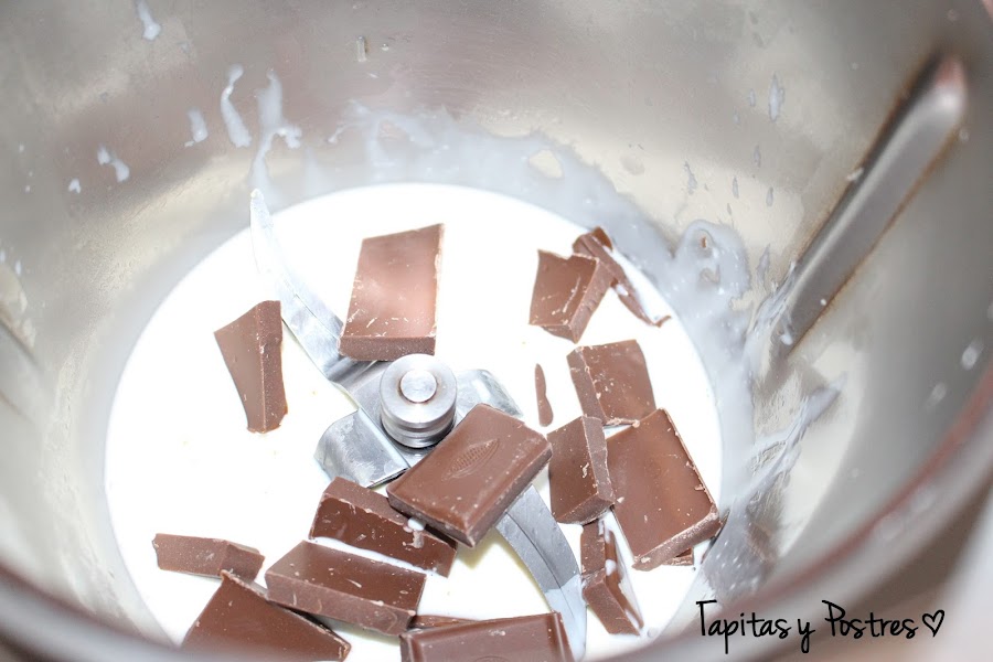 Ponemos la nata (crema de leche), la mantequilla, el chocolate troceado y el café en el vaso de la thermomix y calentamos cinco minutos a 50º y velocidad 3. Podemos hacerlo en un cazo, removiendo todo hasta que el chocolate se funda.