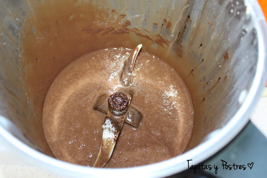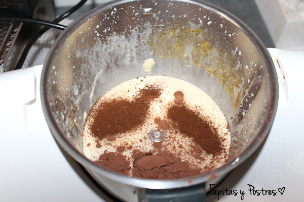 Añadimos la leche, cacao, café y vainilla. Mezclamos y añadimos la harina y levadura