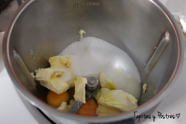 Ponemos los huevos, la mantequilla y el azúcar en el vaso de la thermomix o de una batidora eléctrica y batimos 1 minuto a velocidad 5.