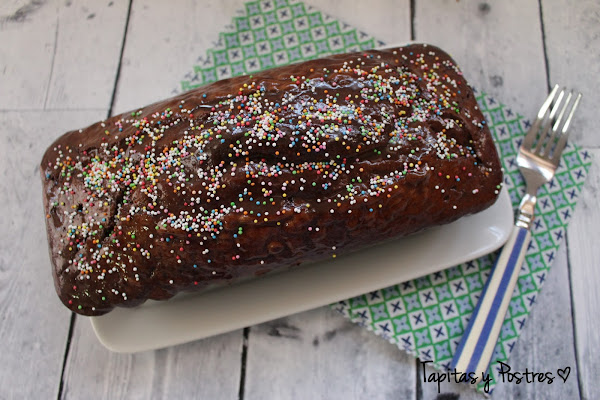 Ponemos el plum cake sobre una rejilla y lo bañamos con el ganache por todos lados, adornamos con bolitas de colores. Dejamos enfriar.