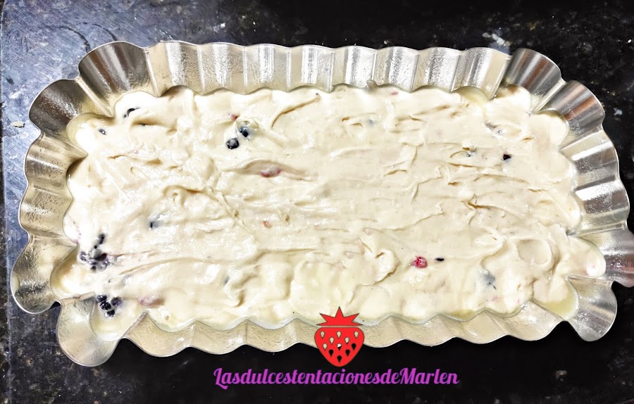 Lava y seca las frutas rojas; añade a la masa anterior, con la mil y el ron. Vierte la masa en el molde y hornea 15 minutos; baja la temperatura a 160 ºC y cuece 1 hora.