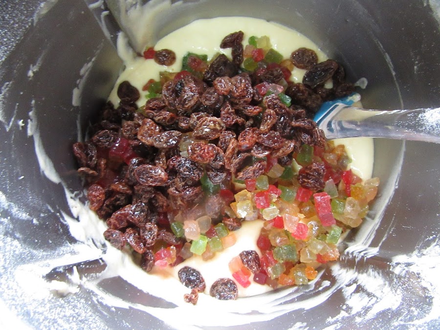 4- Agregar la leche, sal, levadura, aromas y harina y mezclar bien con el turmix o varilla eléctrica. Añadir las frutas troceadas y las pasas y mezclar un poco, no en exceso.