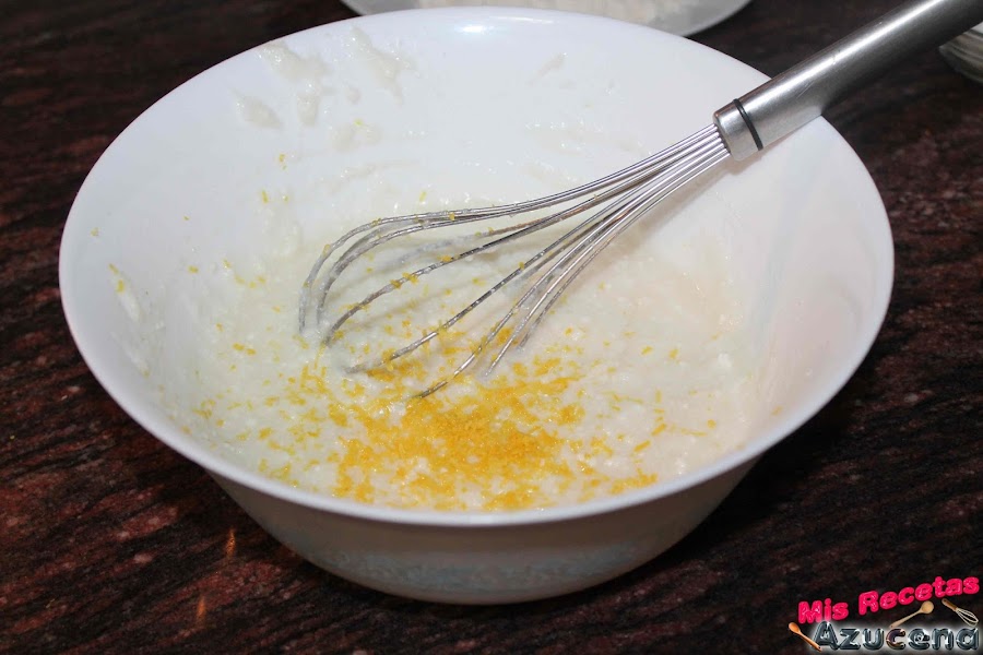 Ahora cogemos un cuenco en el pondremos el requesón ya escurrido junto con el azúcar, lo mezclamos bien y después añadiremos la ralladura de limón y el zumo, volvemos a mezclar.