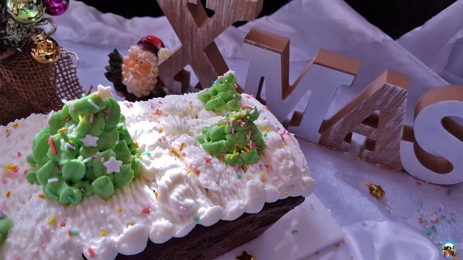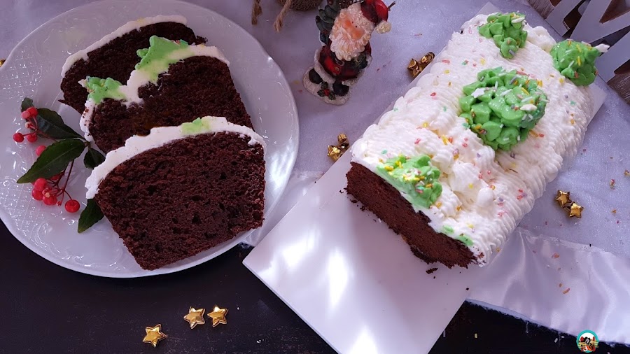 El plum cake lo hice en vísperas..., deje la nata (crema de leche) preparada en la nevera y antes de servirlo lo decore con la nata (crema de leche) y le hice los árboles. Muchas veces mis invitados prefieren ver algo de mi cocina en vivo. Puedes hacer lo mismo, o decorarlo una hora antes.