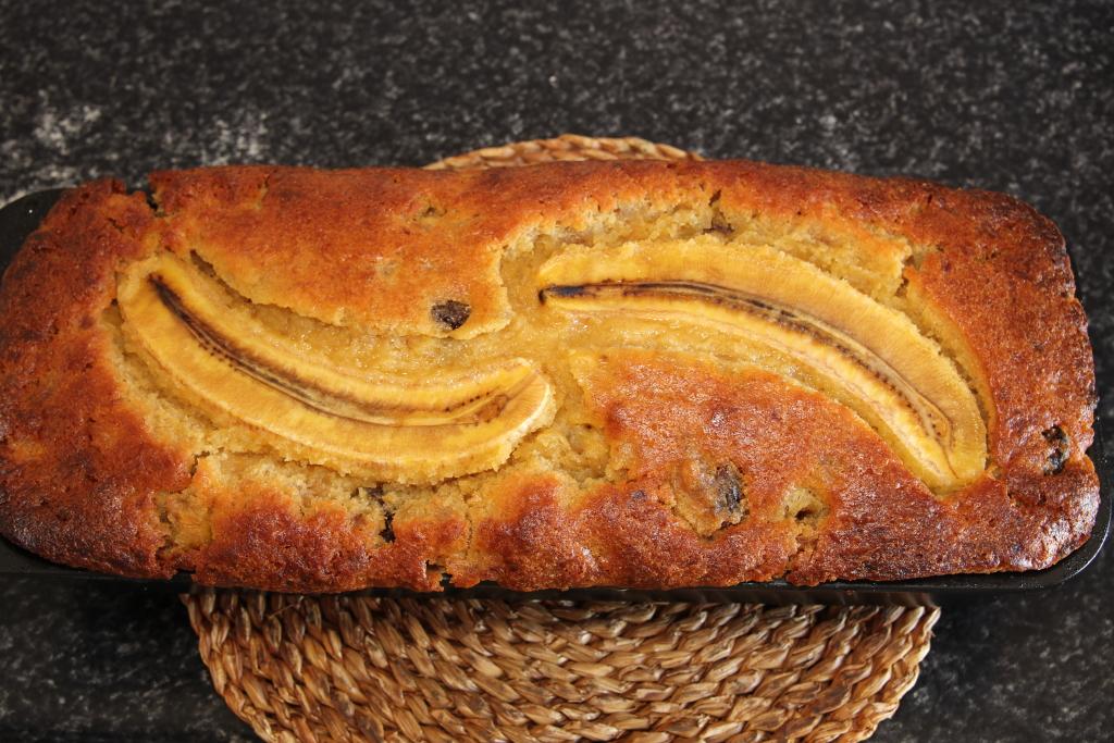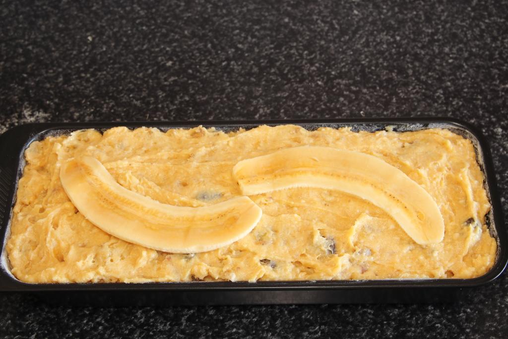 Pasamos la mezcla al molde, apoyamos el plátano reservado, pelado y cortado por la mitad a lo largo, sobre la masa con la parte plana hacia arriba. Horneamos 55 minutos a 180ºC, calor arriba y abajo. Pinchamos con un palito de brocheta y si sale limpio, lo tenemos.