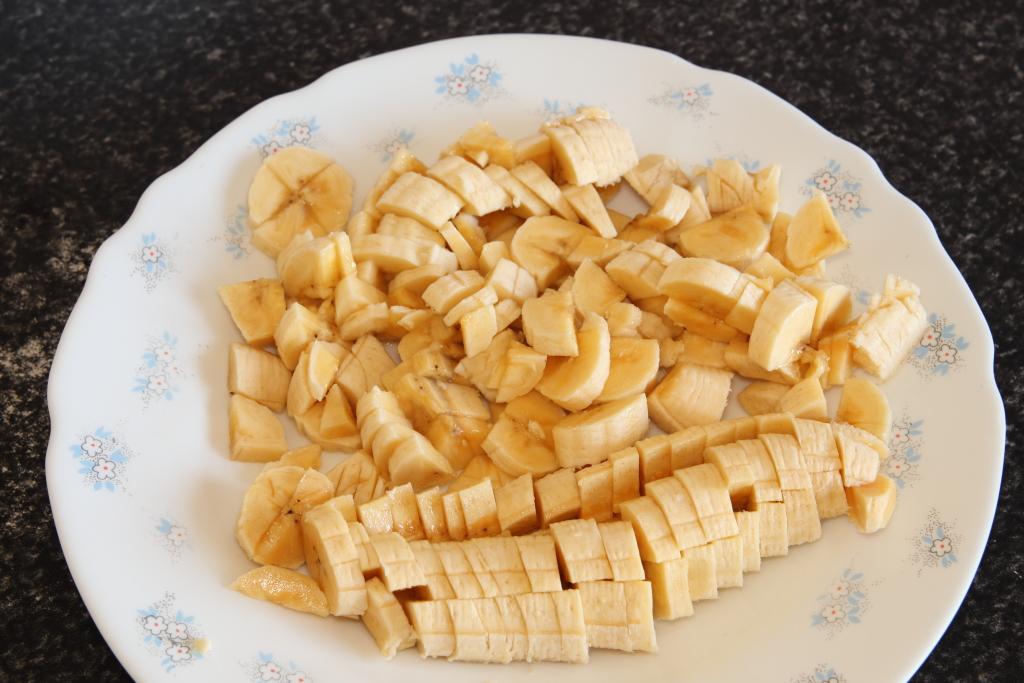 Pelamos y troceamos en dados los plátanos reservando uno entero para finalizar la receta.