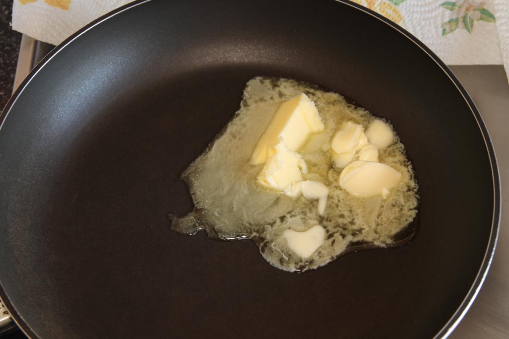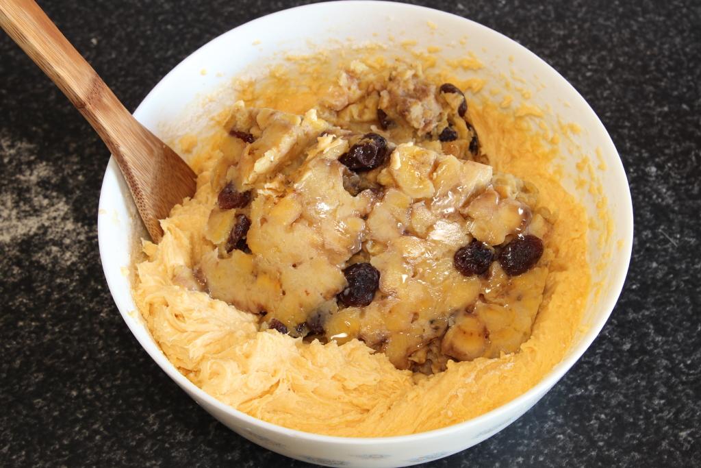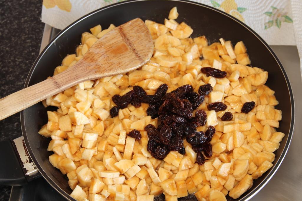 En una sartén echamos las cucharadas soperas de mantequilla, ponemos al fuego, salteamos los plátanos troceados, las pasas y la miel. Removemos y dejamos al fuego hasta que el plátano se ablande, retiramos a un recipiente y cuando se atempere metemos en la nevera a refrescar.