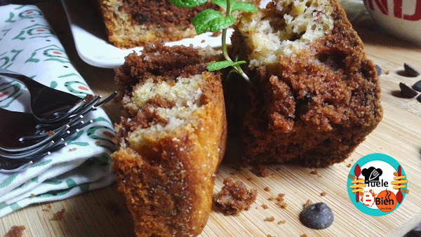 Vertemos primero la masa mezclada con la fruta, en el centro vertemos la masa con chocolate. Rellenamos los lados con la masa de fruta. Horneamos el plum cake 45 minutos, dejamos enfriar y desmoldamos y servimos en porciones.