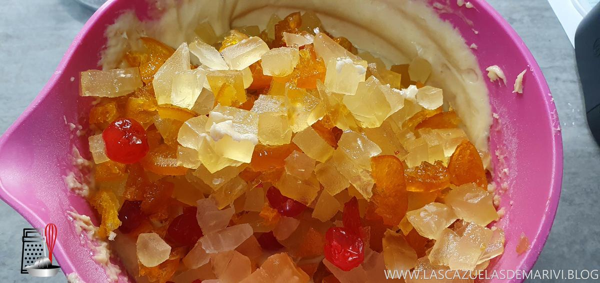 Cortamos en trocitos la fruta, dejándonos unos trozos para luego adornar el plum cake.
