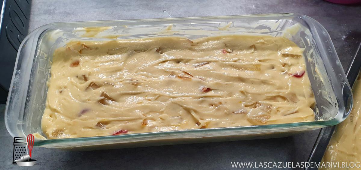 Untamos un molde alargado de cake de mantequilla. Vertemos la masa, sin llegar al final, un poco más de la mitad. Como la masa es muy densa, movemos el molde de un lado a otro para que se distribuya bien y le damos unos golpecitos. Alisamos con la parte de arriba.
