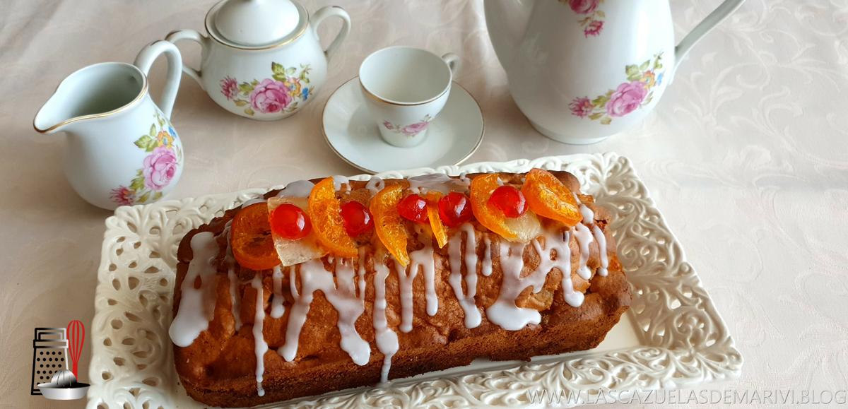 Sacamos, dejamos enfriar en el mismo molde. Una vez frío, lo desmoldamos, lo ponemos en nuestra fuente de presentación y hacemos la glasa con el azúcar glas y el poquito de agua, no tiene que quedar demasiado líquida ni demasiado espesa. Lo suficiente para hacer hilos con una cucharara por encima. Ponemos la fruta que nos hemos dejamdo para adornar.