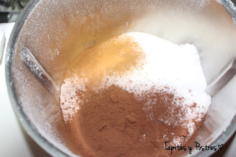 Ponemos la harina y el azúcar en el vaso de la thermomix y programamos 5 segundos a velocidad 5. Añadimos el cacao, la canela y mezclamos 5 segundos a velocidad 5.